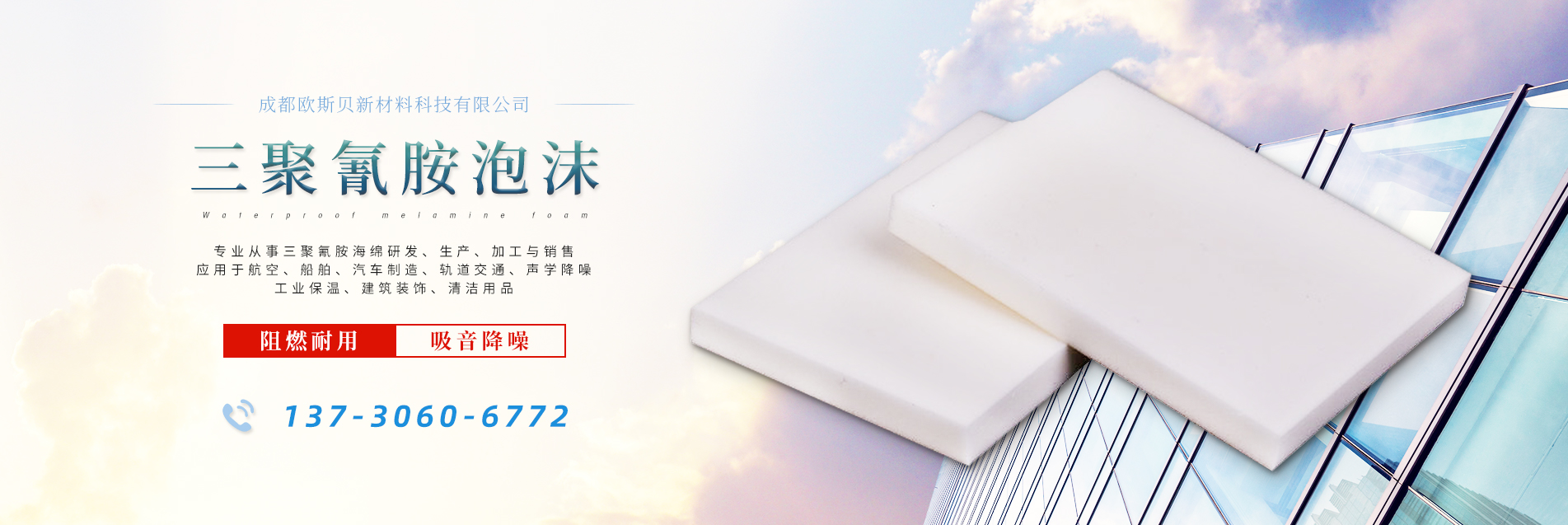 服務(wù)熱線: 成都?xì)W斯貝新材料科技有限公司是一家專(zhuān)業(yè)從事三聚氰胺海綿研發(fā)、生產(chǎn)、加工與銷(xiāo)售的高科技公司。專(zhuān)業(yè)的人才結(jié)構(gòu)及多年積累的技術(shù)沉淀保證了公司在國(guó)內(nèi)的科研生產(chǎn)及質(zhì)量管控能力。開(kāi)發(fā)的產(chǎn)品已廣泛應(yīng)用于航空、船舶、汽車(chē)制造、軌道交通、聲學(xué)降噪、工業(yè)保溫、建筑裝飾、清潔及日用品等多個(gè)領(lǐng)域,受到了國(guó)內(nèi)外客戶(hù)的一致好評(píng)!成都?xì)W斯貝新材料科技有限公司以專(zhuān)業(yè)的研發(fā)能力,過(guò)硬的產(chǎn)品質(zhì)量,真誠(chéng)完善的專(zhuān)業(yè)化售前售中售后服務(wù)致力于打造國(guó)內(nèi)三聚氰胺海綿行業(yè)的明星企業(yè),與客戶(hù)一起再創(chuàng)新的輝煌!